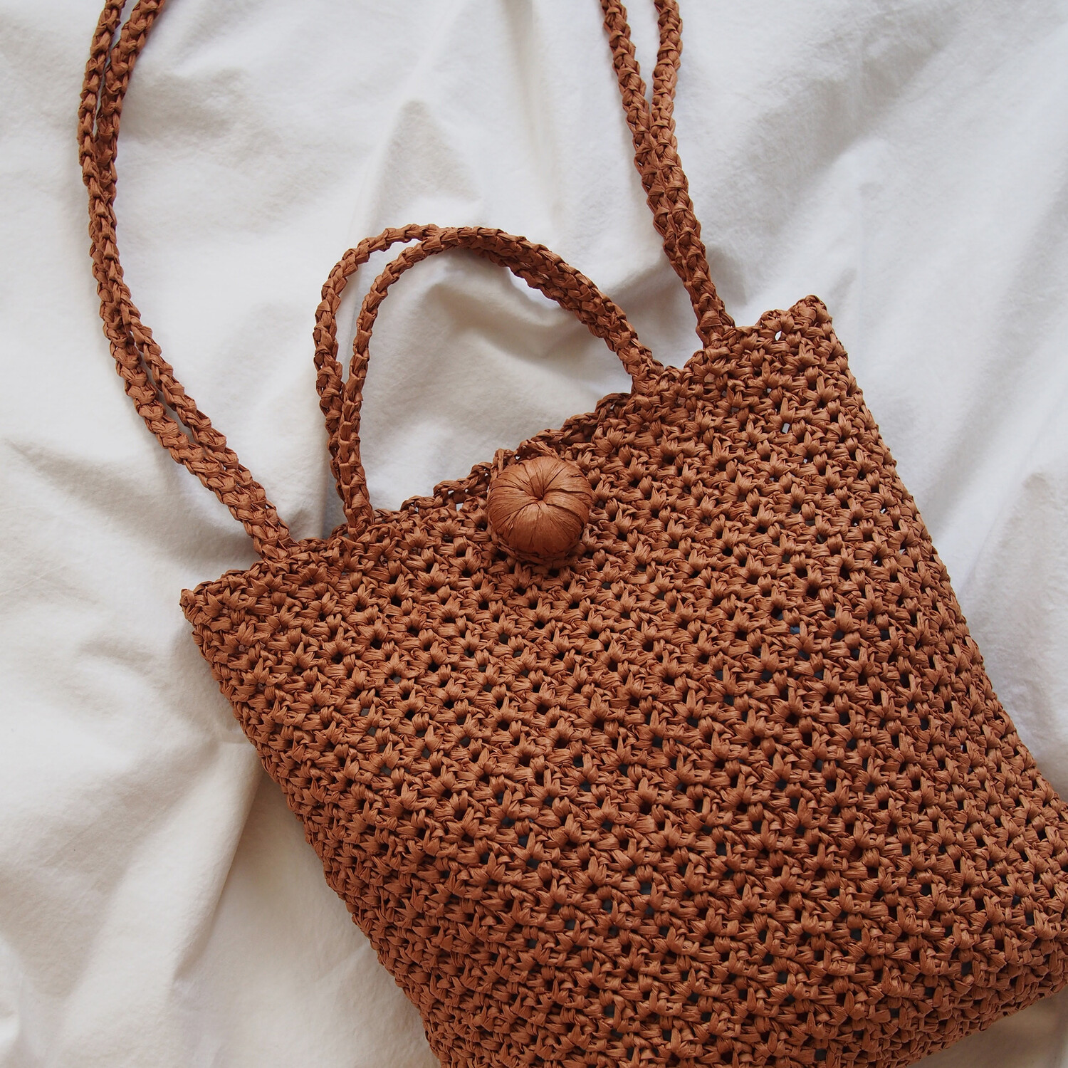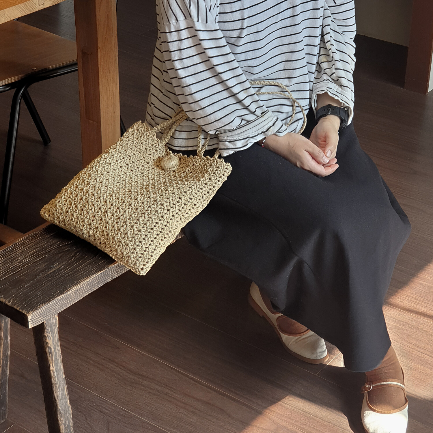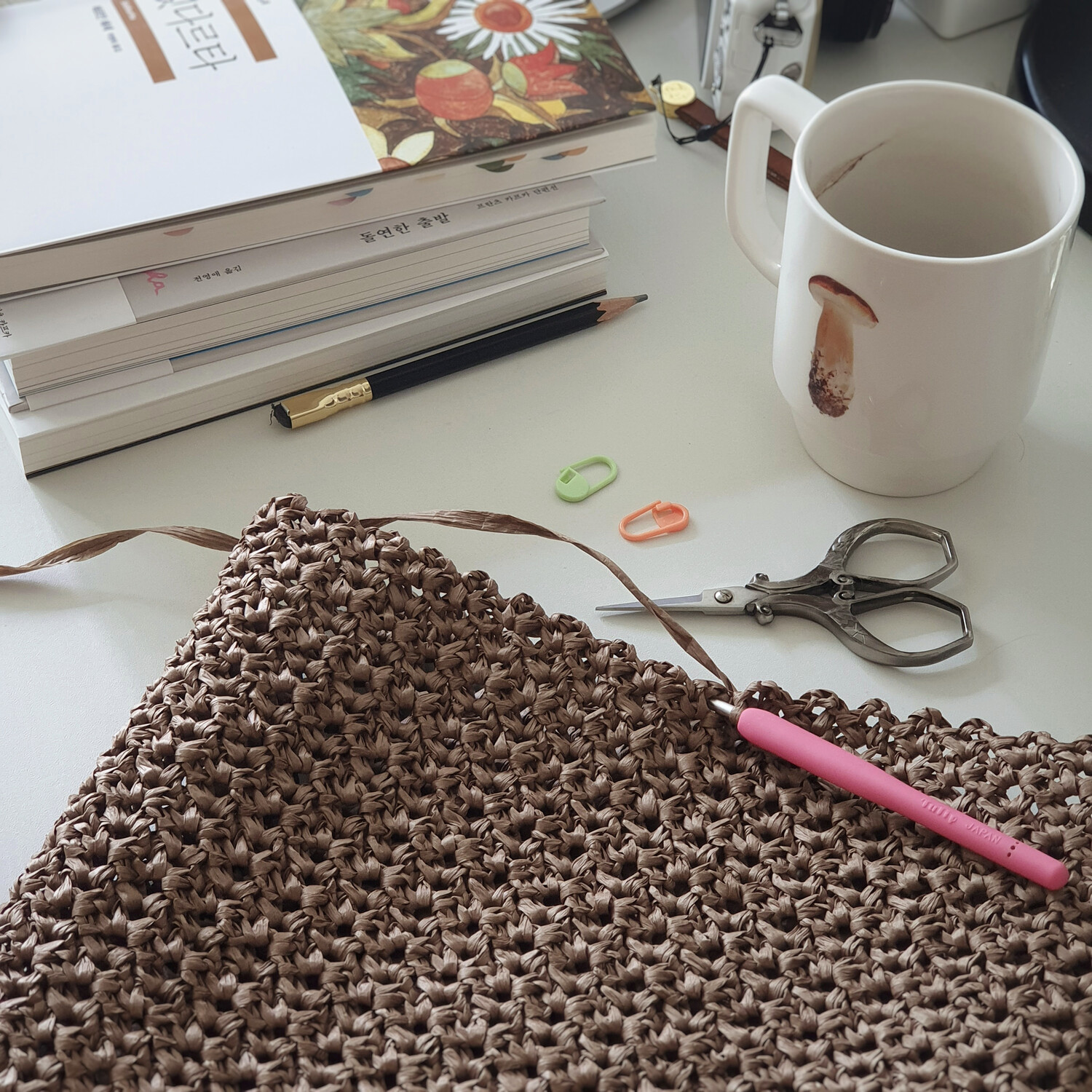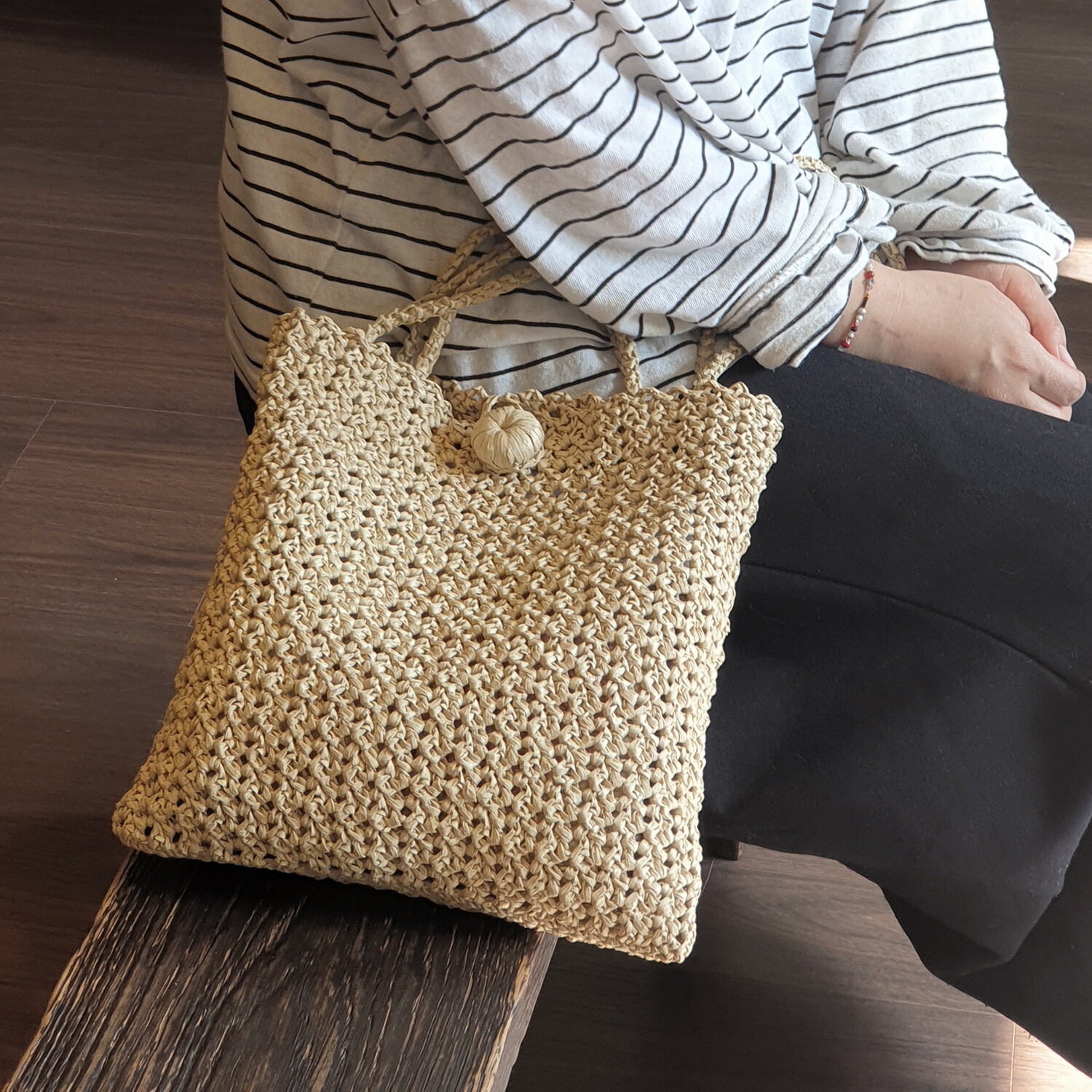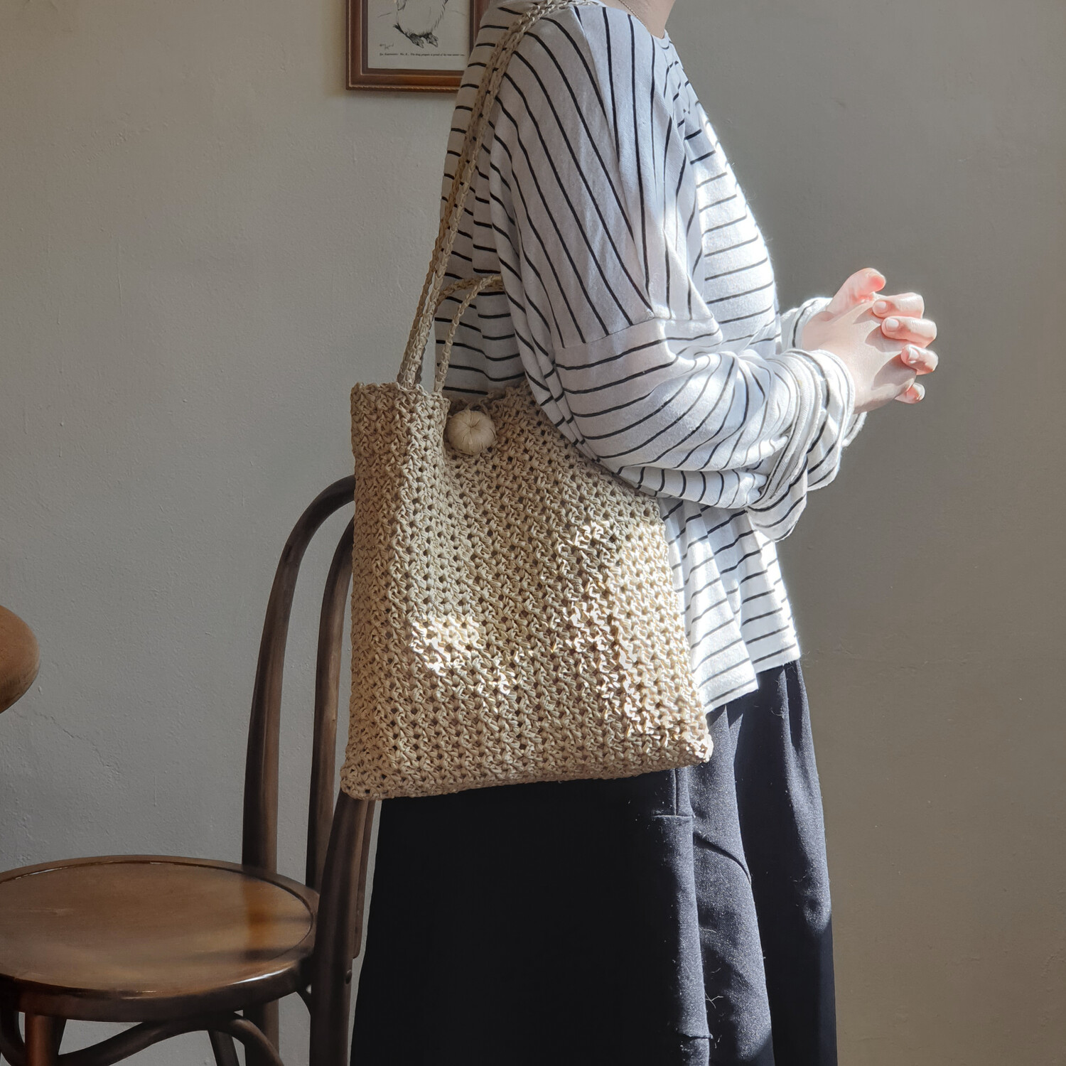 페미닌한 느낌이 물씬 나는 미니쉘 패턴의 가방입니다. 조직감이 너무 촘촘하지 않은데다 펄프얀 소재라서 서걱서걱 시원하고 가벼운 느낌의 가방입니다. 편안하게 들 수 있는 너무 작지도 너무 크지도 않은 가방입니다. 어렵지 않아서 부담없이 뜨실 수 있어요. 토트끈과 숄더끈을 모두 달아서 좀 더 편안하게 사용하실 수 있어요. 취향에 따라 숄더끈 또는 토트끈 한가지만 달아도 괜찮아요. 어떤 스타일에도 잘 어울리는 가방, 꼭 떠보세요.