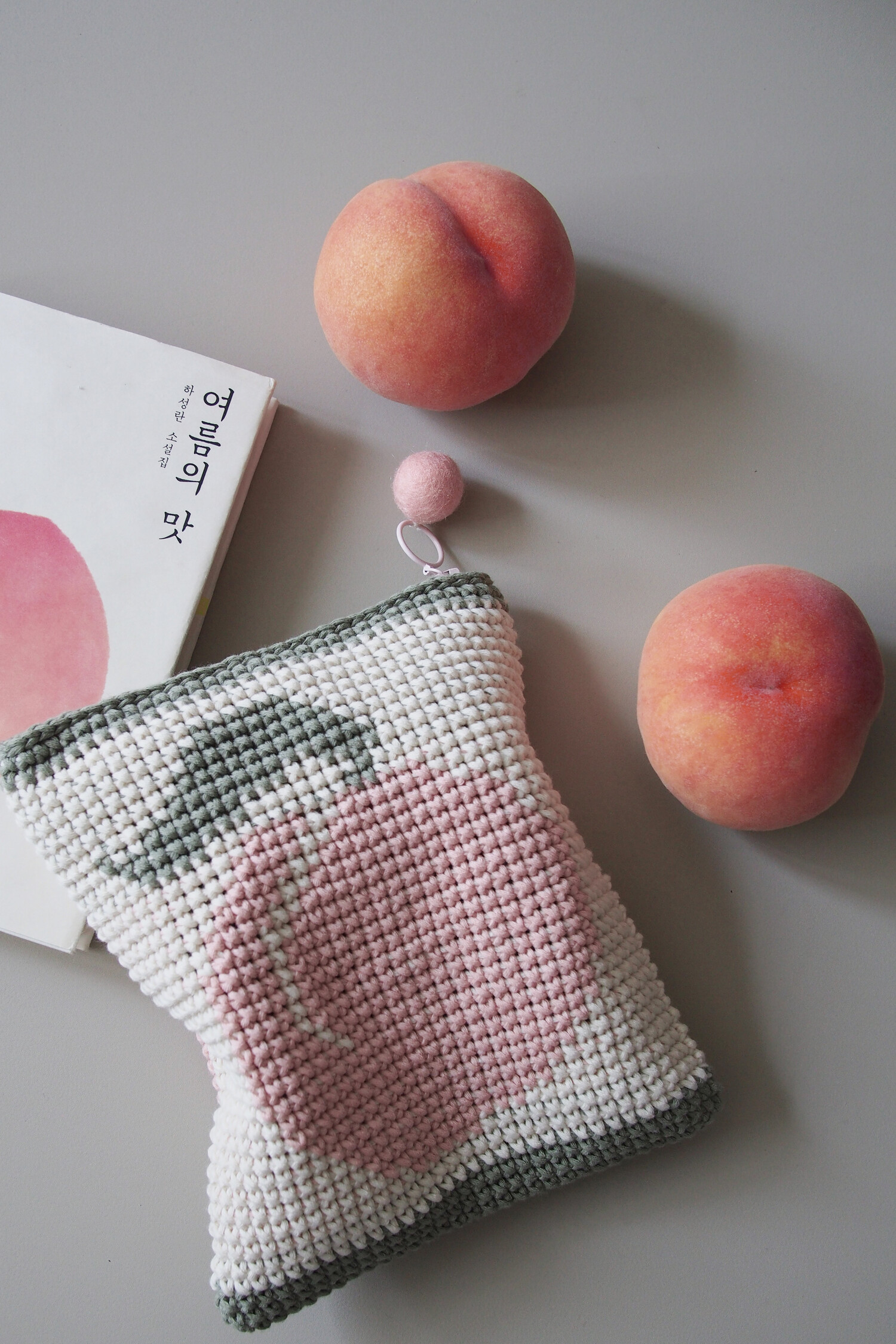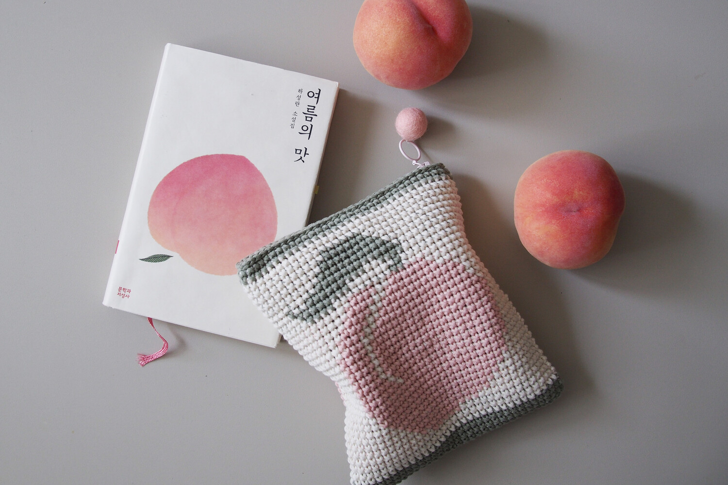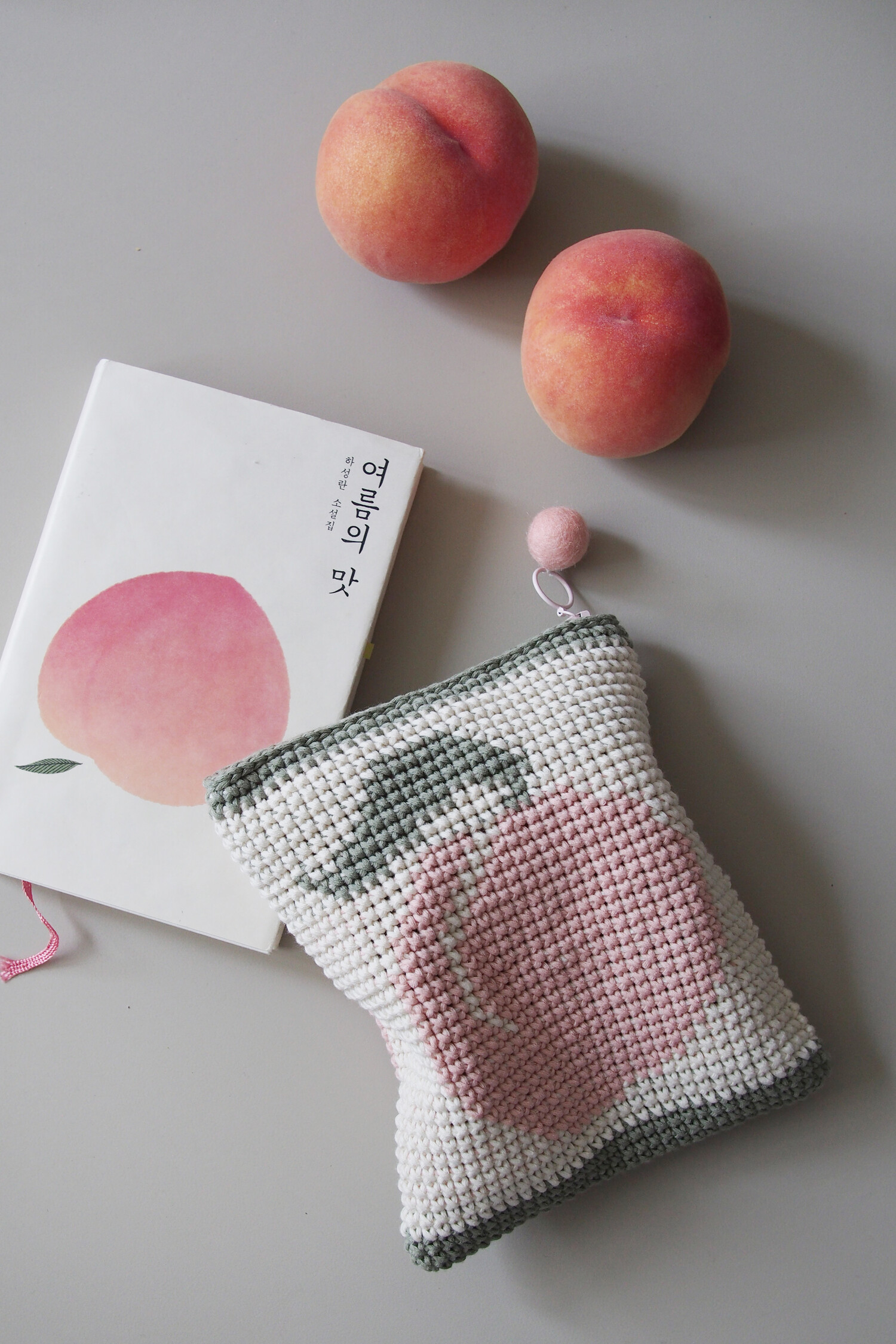 몇 해 전에 복숭아 파우치를 뜨고서 진행을 하지 않았는데요, 조금 수정해서 큰 복숭아 한 알이 먹음직스러운 파우치로 완성되었습니다. 과즙이 흐르고 달콤한 향기가 날 것 같은 복숭아 파우치예요. 배색뜨기 키트는 항상 이랑뜨기로 뜨도록 작업했었는데요. 이번엔 변형 짧은뜨기로 뜨는 도안입니다. 한 코 한 코가 큐브형태로 도드라져서 기존의 짧은뜨기와는 완성작의 느낌이 완전히 다르더라고요. 처음엔 어색할 수 있지만 금방 익숙하게 뜨실 수 있으니 영상의 도움을 받아 예쁜 복숭아 파우치를 함께 완성해봐요.