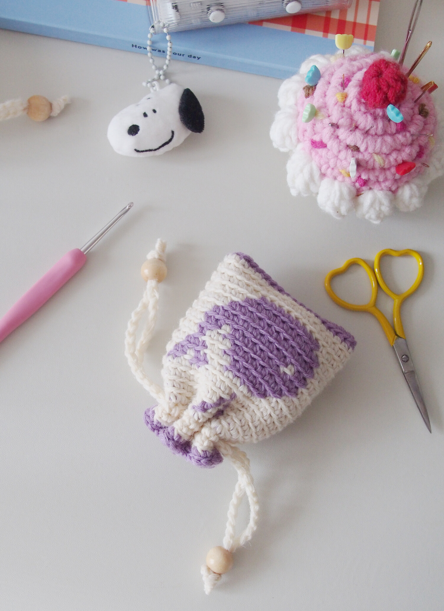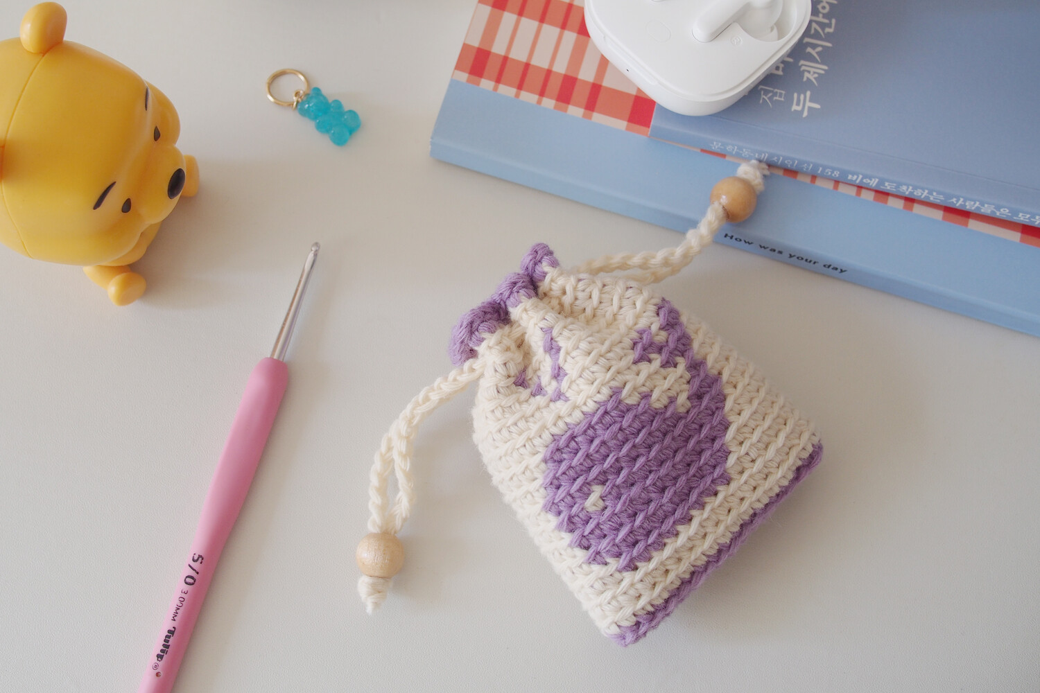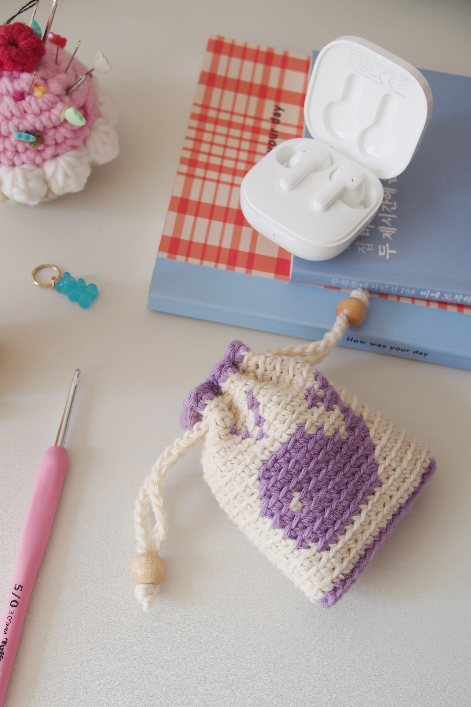 많이 사용하시는 이어폰 케이스에 맞춘 미니 사이즈 스트링 파우치입니다. 보라색 고래 패턴이 사랑스러운 작은 파우치예요. 에어팟이나 버즈, QCY 등 다양한 이어폰의 케이스로 활용하실 수 있습니다. 작은 사이즈라 여러개 떠서 선물하기에도 아주 좋은 아이템이 되겠죠? 배색뜨기로 큰 파우치를 작업하기 두려우셨던 분들도 이번 작은 파우치로 도전해보세요.