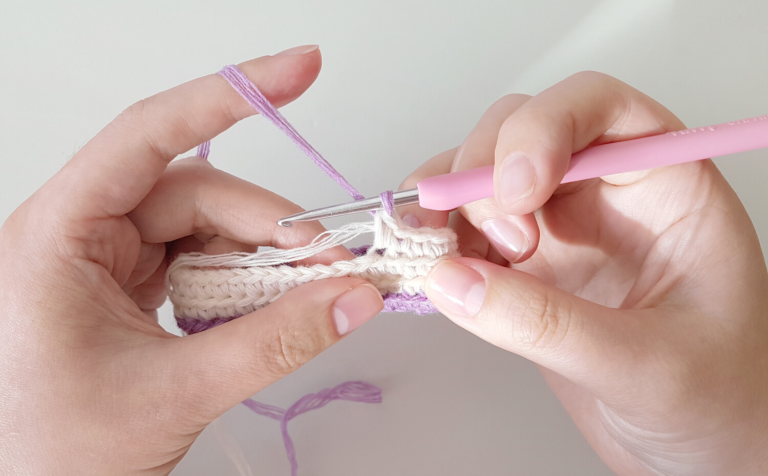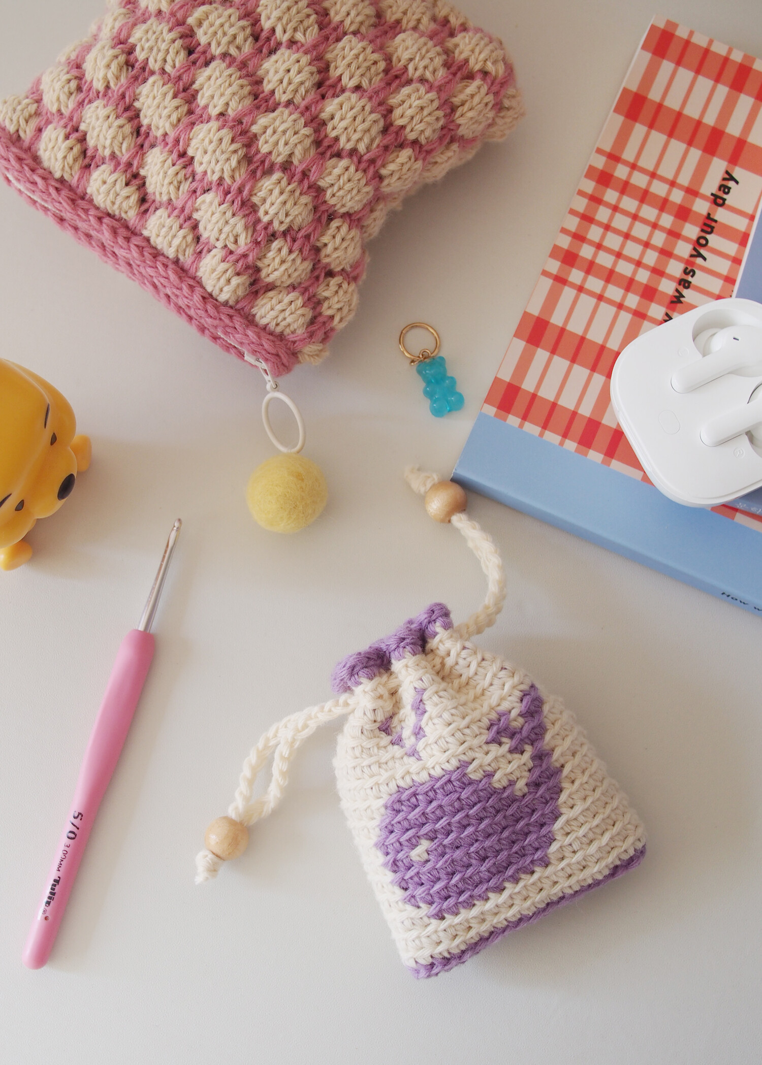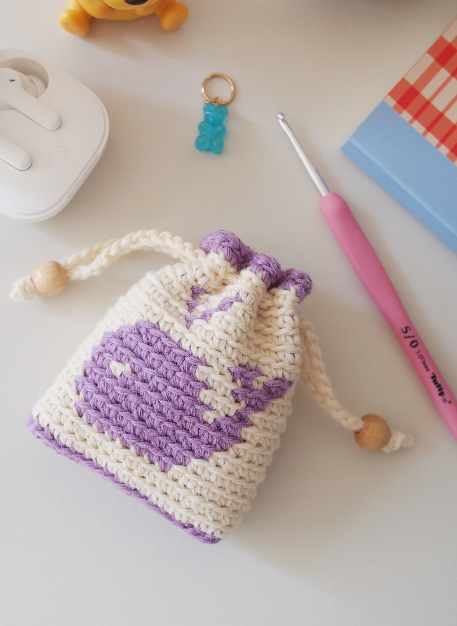 많이 사용하시는 이어폰 케이스에 맞춘 미니 사이즈 스트링 파우치입니다. 보라색 고래 패턴이 사랑스러운 작은 파우치예요. 에어팟이나 버즈, QCY 등 다양한 이어폰의 케이스로 활용하실 수 있습니다. 작은 사이즈라 여러개 떠서 선물하기에도 아주 좋은 아이템이 되겠죠? 배색뜨기로 큰 파우치를 작업하기 두려우셨던 분들도 이번 작은 파우치로 도전해보세요.