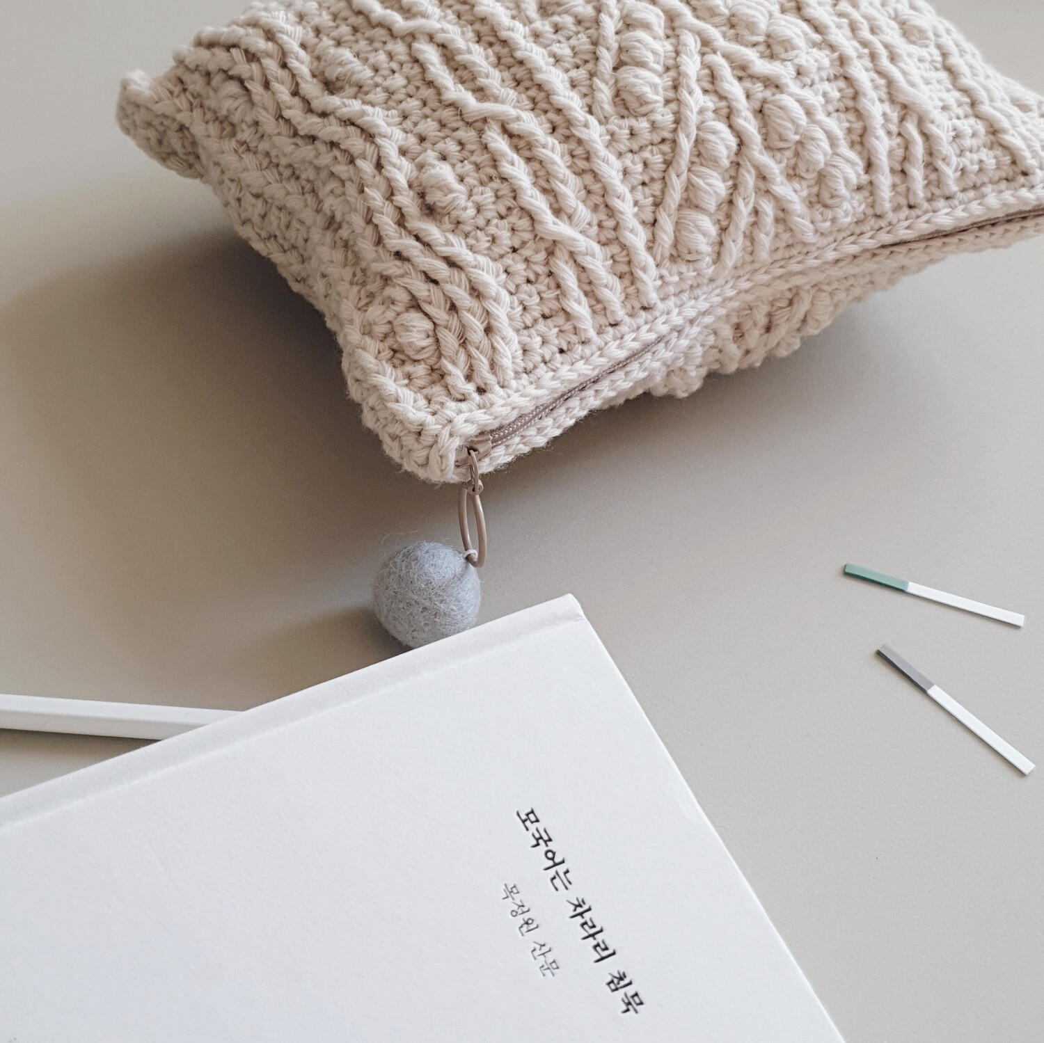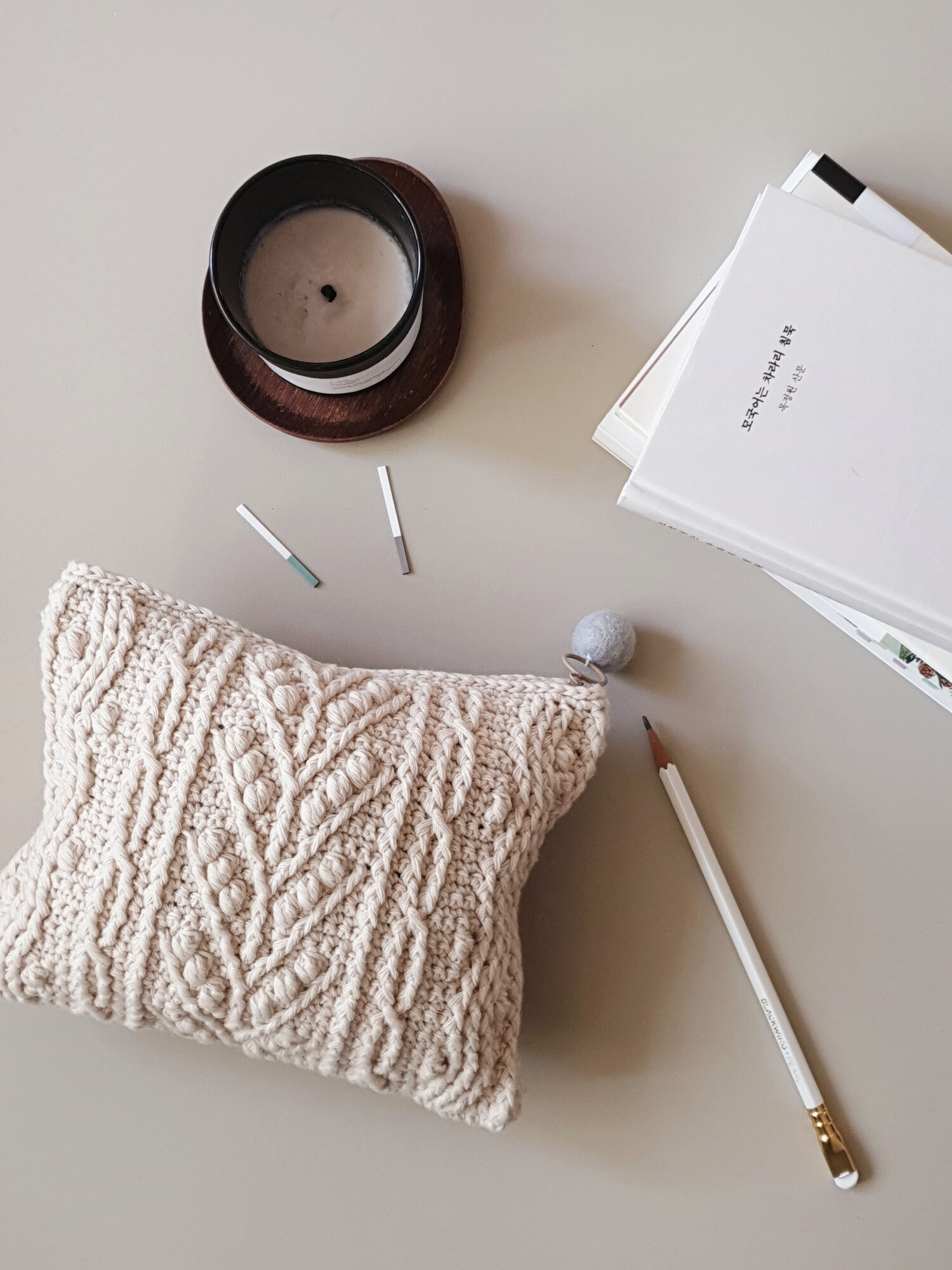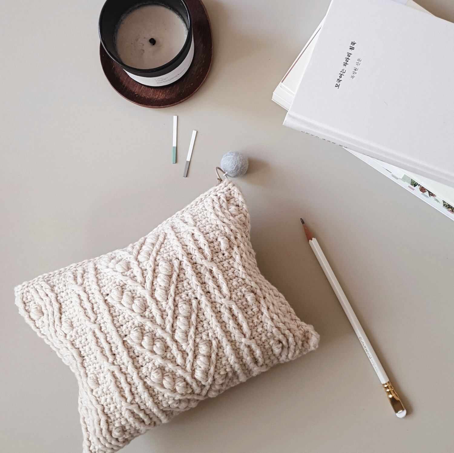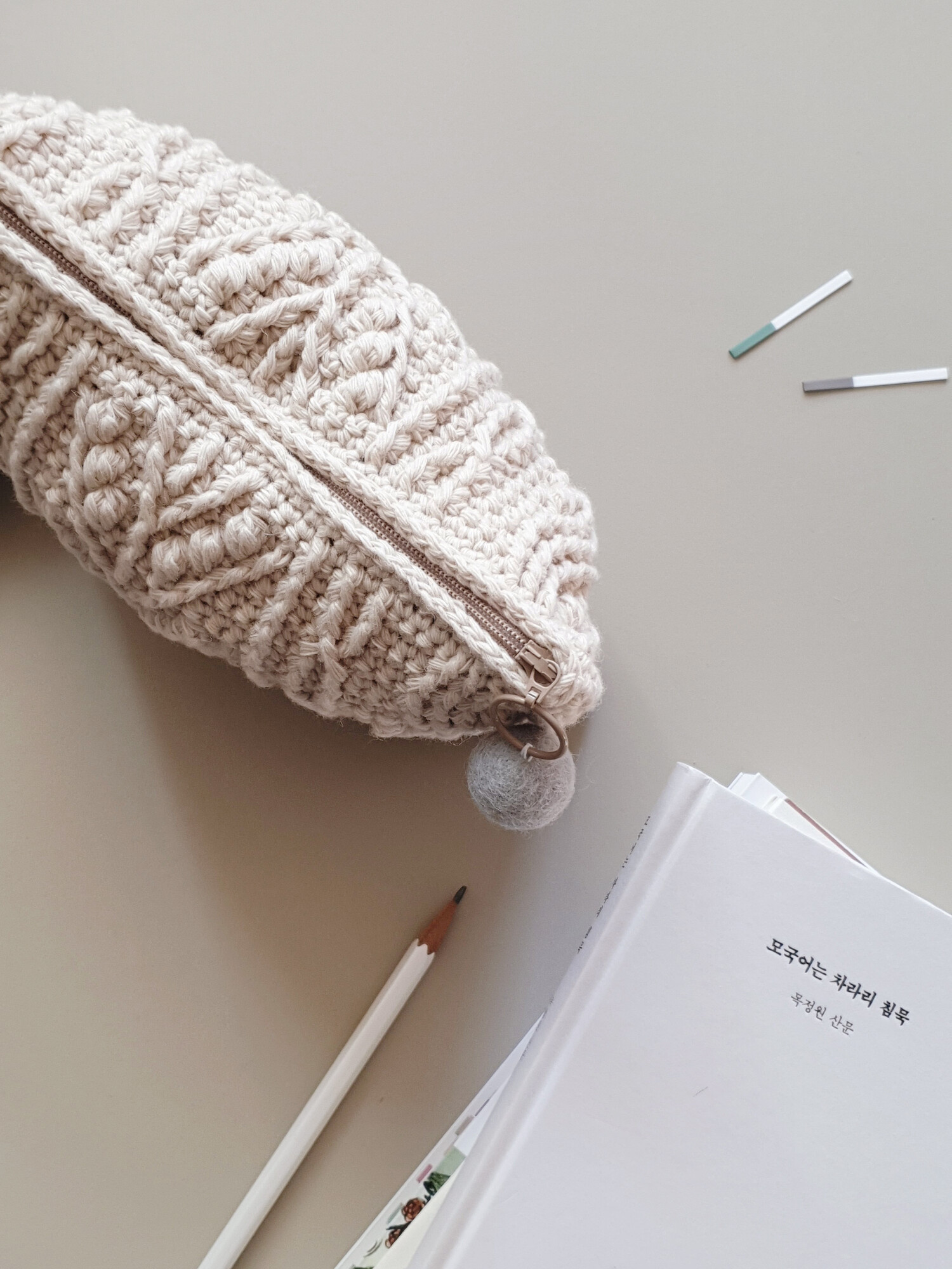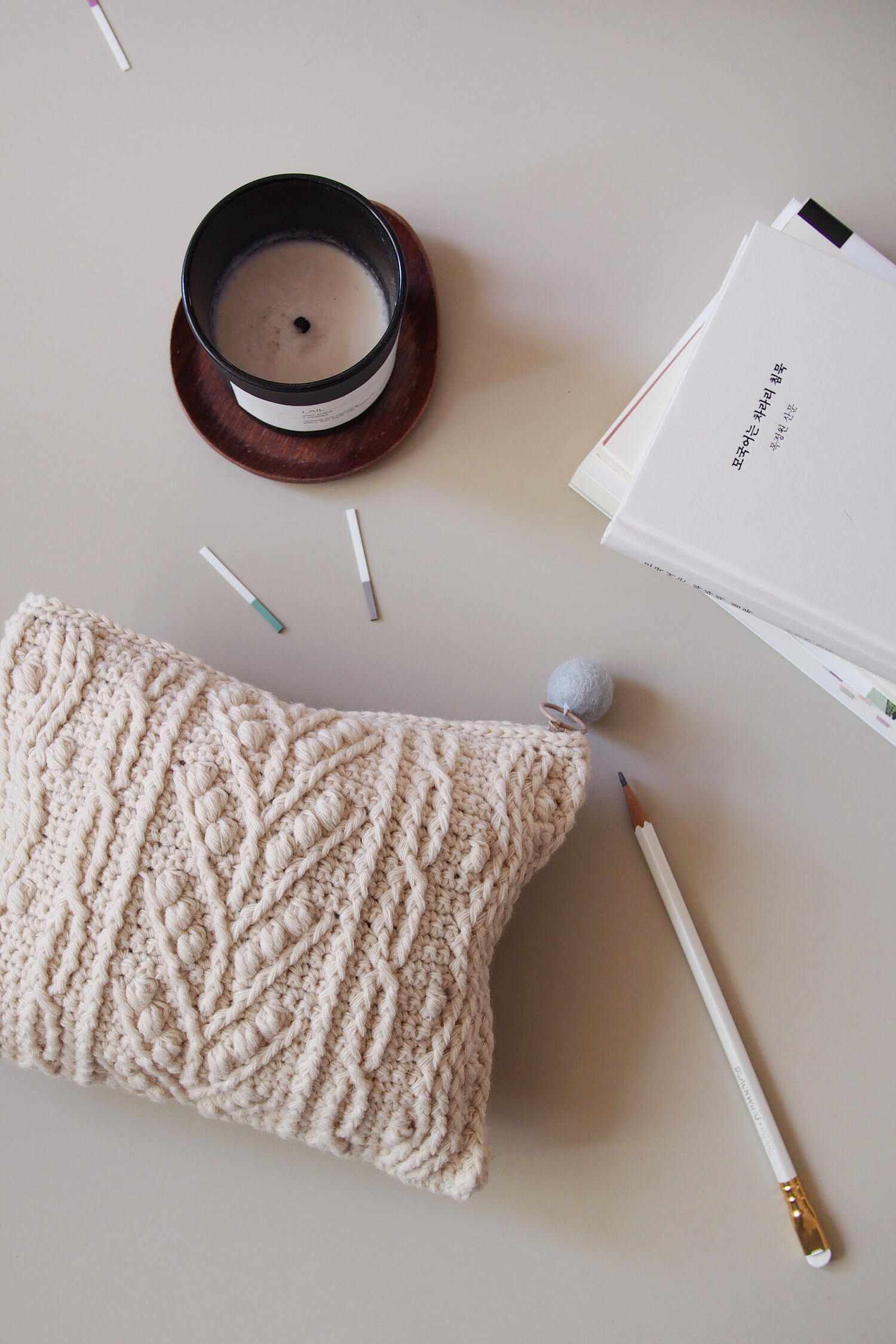 대바늘 패턴에서 많이 볼 수 있는 아란 무늬를 코바늘로 뜨는 파우치입니다. 입체적인 편물을 뜨는 재미가 있습니다. 도안만 보면 복잡해보이지만 떠보면 전혀 어렵지 않고 재밌어서 많이 많이 추천하고 싶은 D.I.Y 키트예요. 넉넉하고 깊은 파우치라 수납력이 좋고요. 아란 패턴이 이 계절에 참 따스해보이네요. 컬러는 두 가지고요. 옵션에서 구성 선택 하실 수 있습니다. 그레이 컬러는 멜란지 그레이구요, 크림 컬러는 아주 살짝 멜란지 합니다.