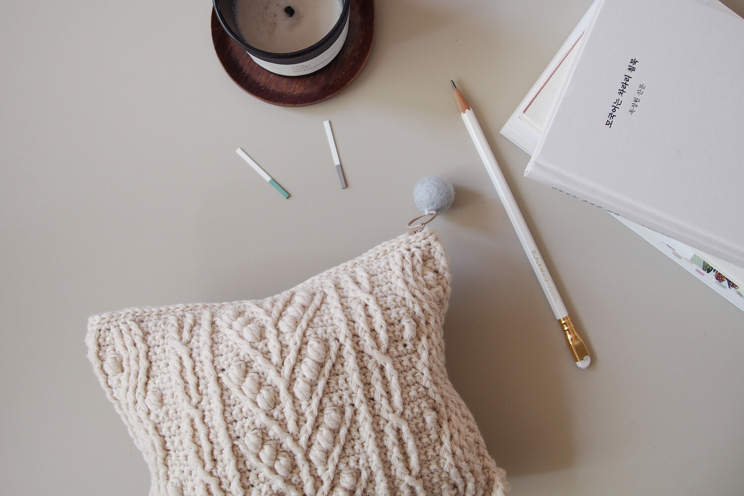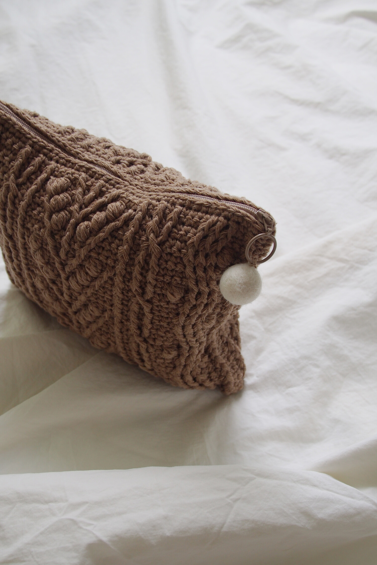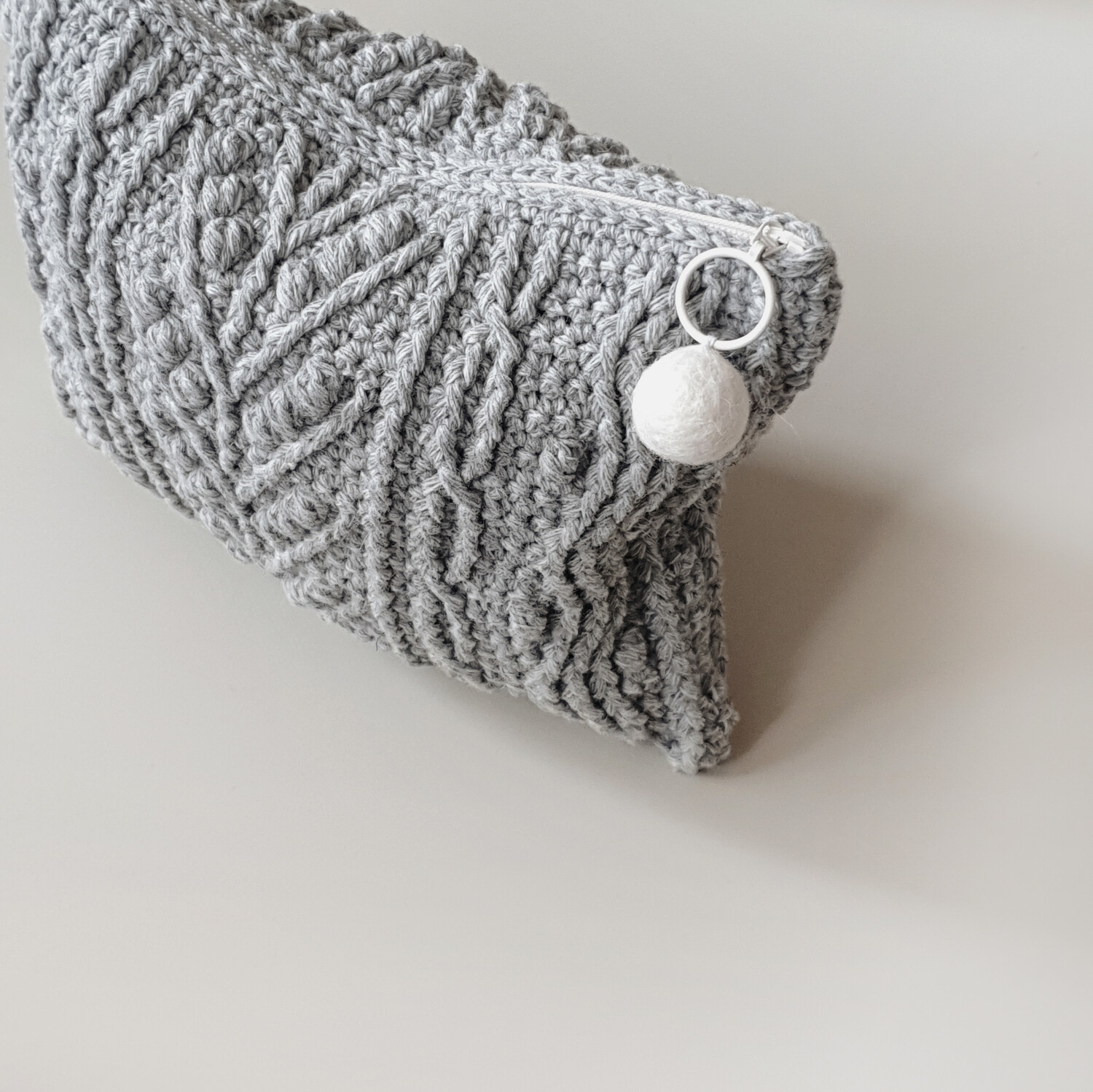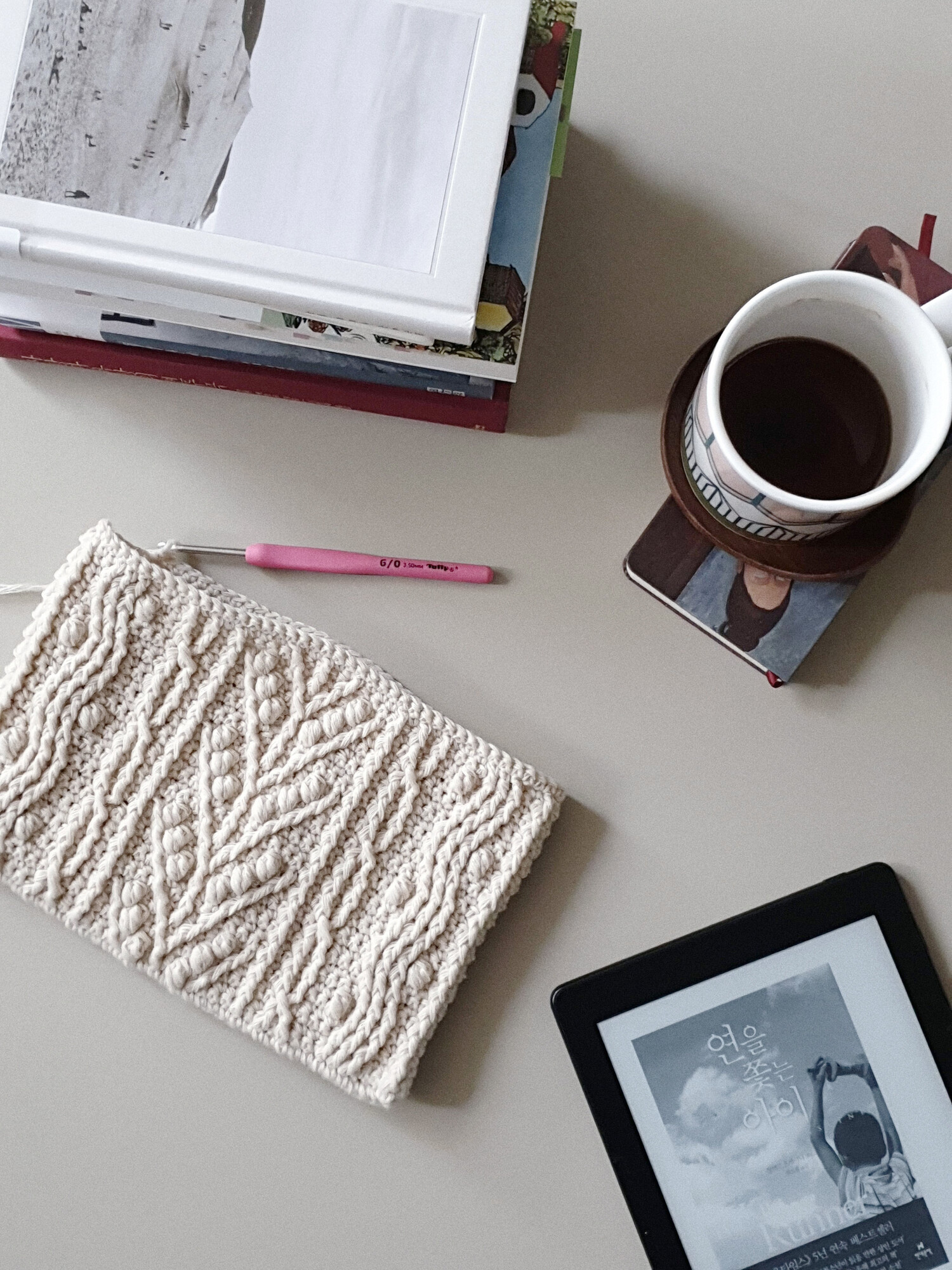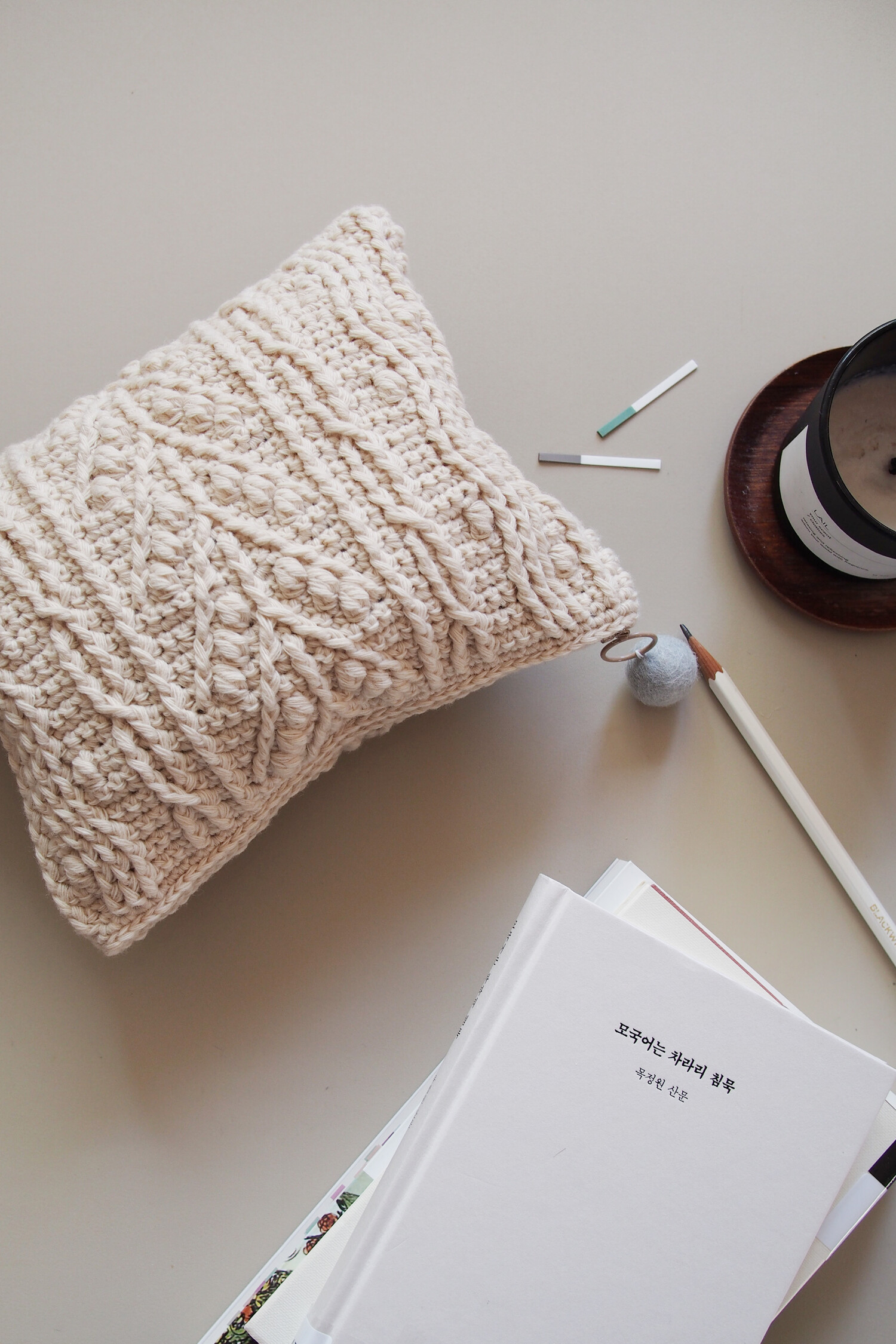 대바늘 패턴에서 많이 볼 수 있는 아란 무늬를 코바늘로 뜨는 파우치입니다. 입체적인 편물을 뜨는 재미가 있습니다. 도안만 보면 복잡해보이지만 떠보면 전혀 어렵지 않고 재밌어서 많이 많이 추천하고 싶은 D.I.Y 키트예요. 넉넉하고 깊은 파우치라 수납력이 좋고요. 아란 패턴이 이 계절에 참 따스해보이네요. 컬러는 두 가지고요. 옵션에서 구성 선택 하실 수 있습니다. 그레이 컬러는 멜란지 그레이구요, 크림 컬러는 아주 살짝 멜란지 합니다.
