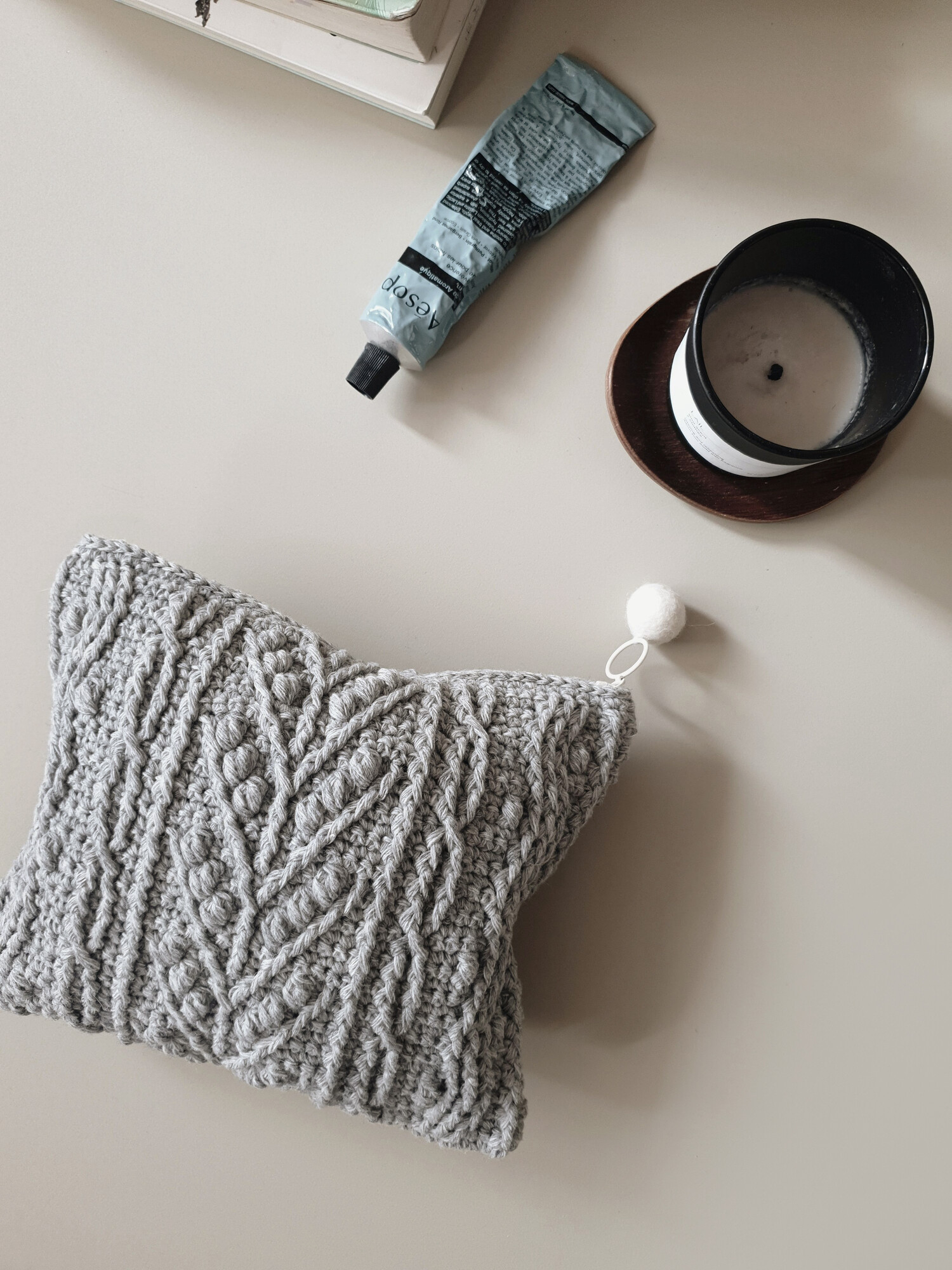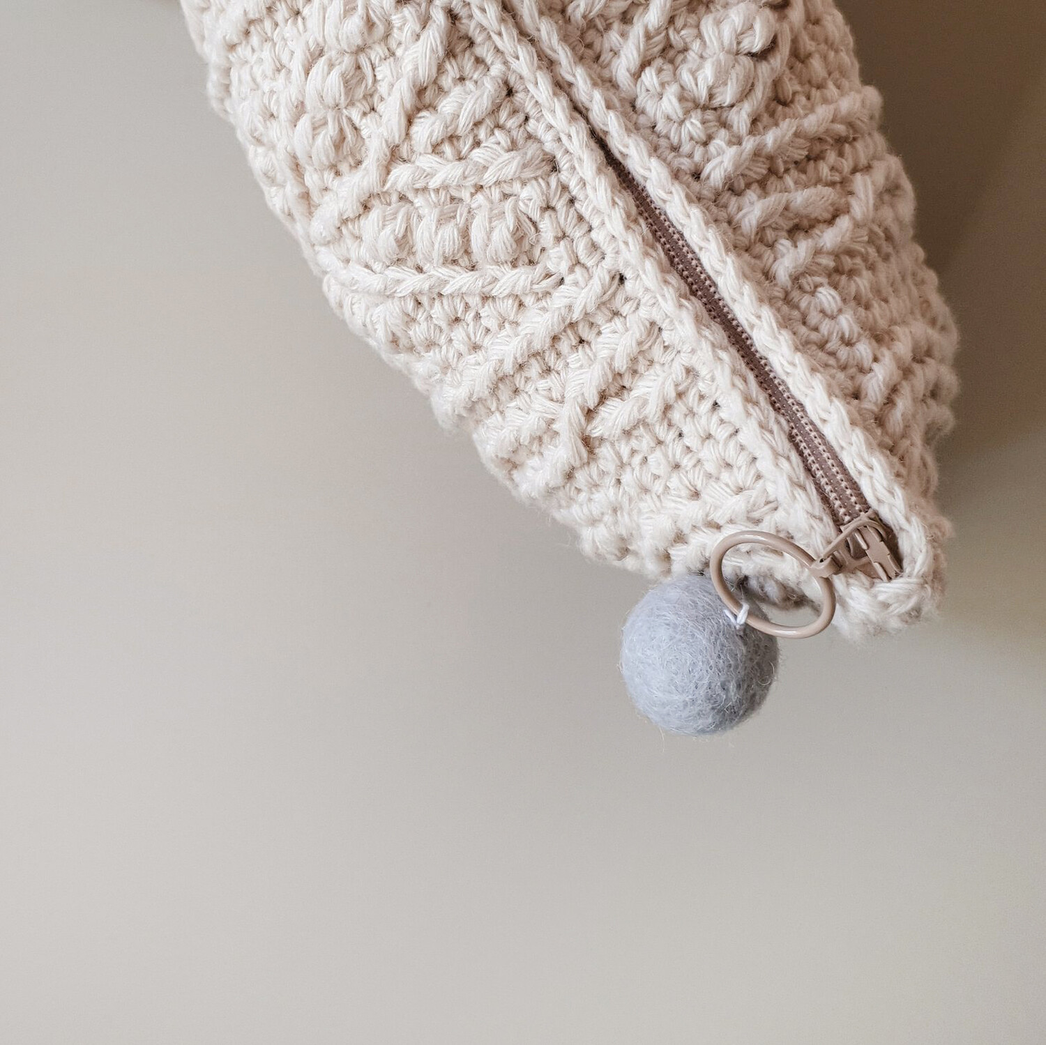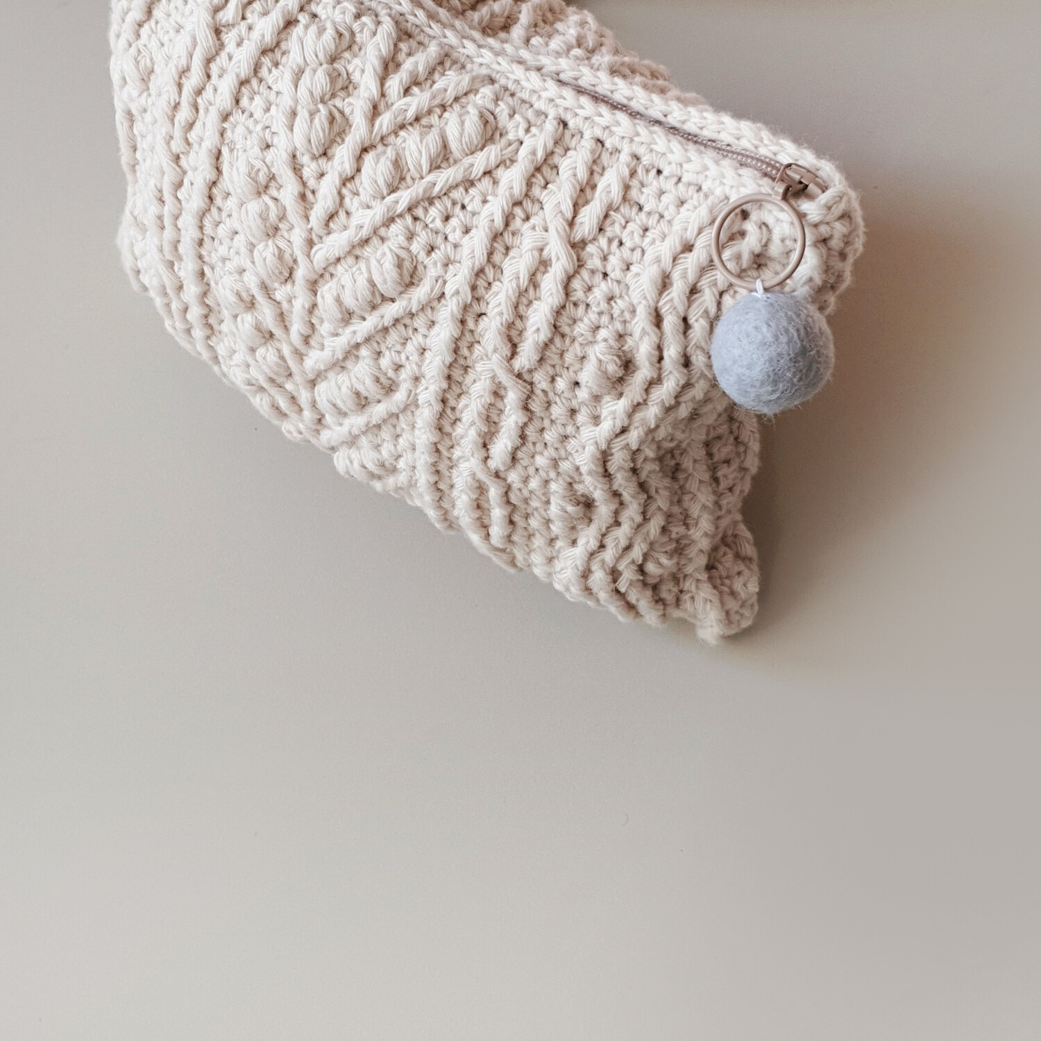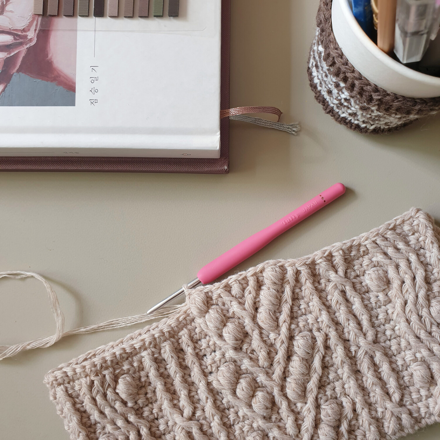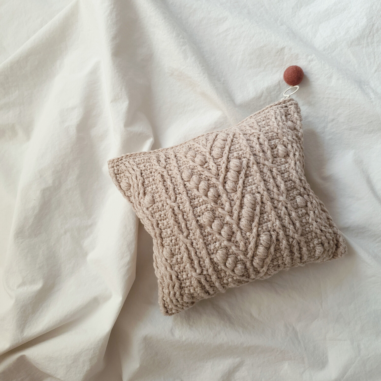 대바늘 패턴에서 많이 볼 수 있는 아란 무늬를 코바늘로 뜨는 파우치입니다. 입체적인 편물을 뜨는 재미가 있습니다. 도안만 보면 복잡해보이지만 떠보면 전혀 어렵지 않고 재밌어서 많이 많이 추천하고 싶은 D.I.Y 키트예요. 넉넉하고 깊은 파우치라 수납력이 좋고요. 아란 패턴이 이 계절에 참 따스해보이네요. 컬러는 두 가지고요. 옵션에서 구성 선택 하실 수 있습니다. 그레이 컬러는 멜란지 그레이구요, 크림 컬러는 아주 살짝 멜란지 합니다.