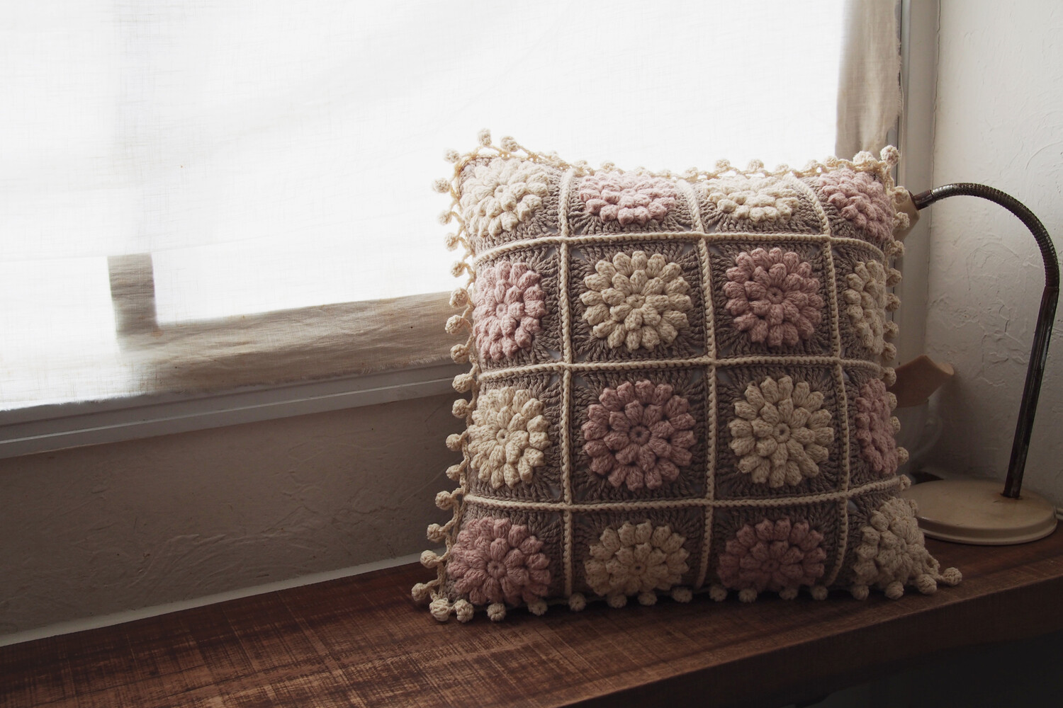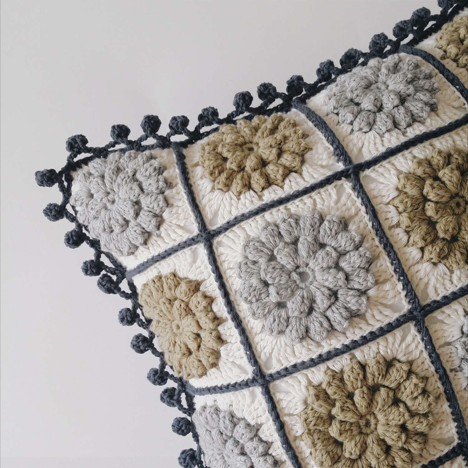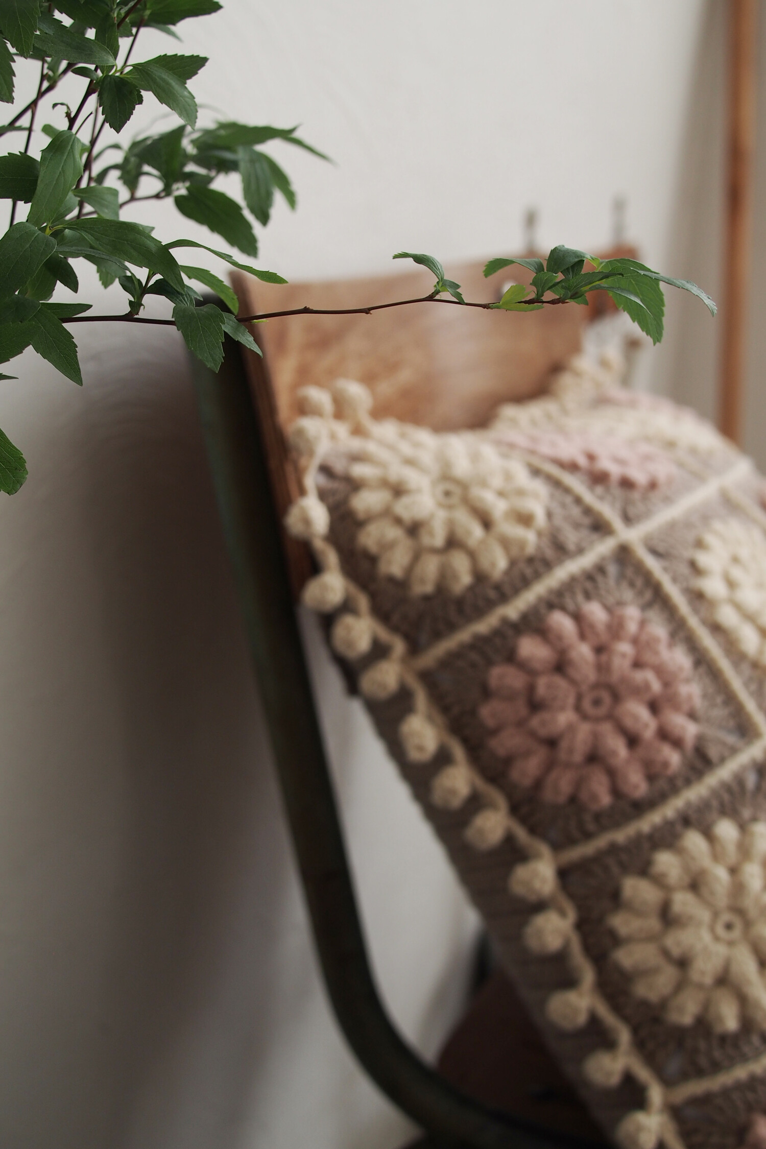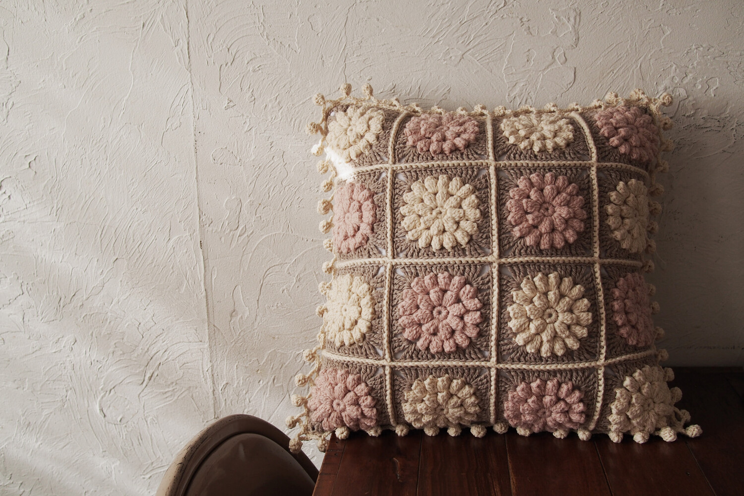 팝콘뜨기를 연습하면서 뜰 수 있는 모티브 쿠션입니다. 조각조각 모티브를 만들어 잇고 뒷면도 떠서 쿠션솜을 넣어 사용하면 됩니다. 보여드릴 컬러는 두가지예요. 첫번째 컬러인 올리브 그린 컬러는 화이트, 그레이, 올리브그린, 먹에 가까운 네이비의 조합이고요 제 개인적으로는 아주 유니크한 컬러조합이라고 생각합니다. 두번째 컬러인 핑크 컬러는 사랑스러운 느낌으로 떠 본 크림색과 옅은 핑크, 그리고 베이지의 조합입니다. 조금 로맨틱하기도 하고 빈티지하기도 하답니다. 그리고 포인트가 될 수 있는 폼폼엣징도 봐주세요.
