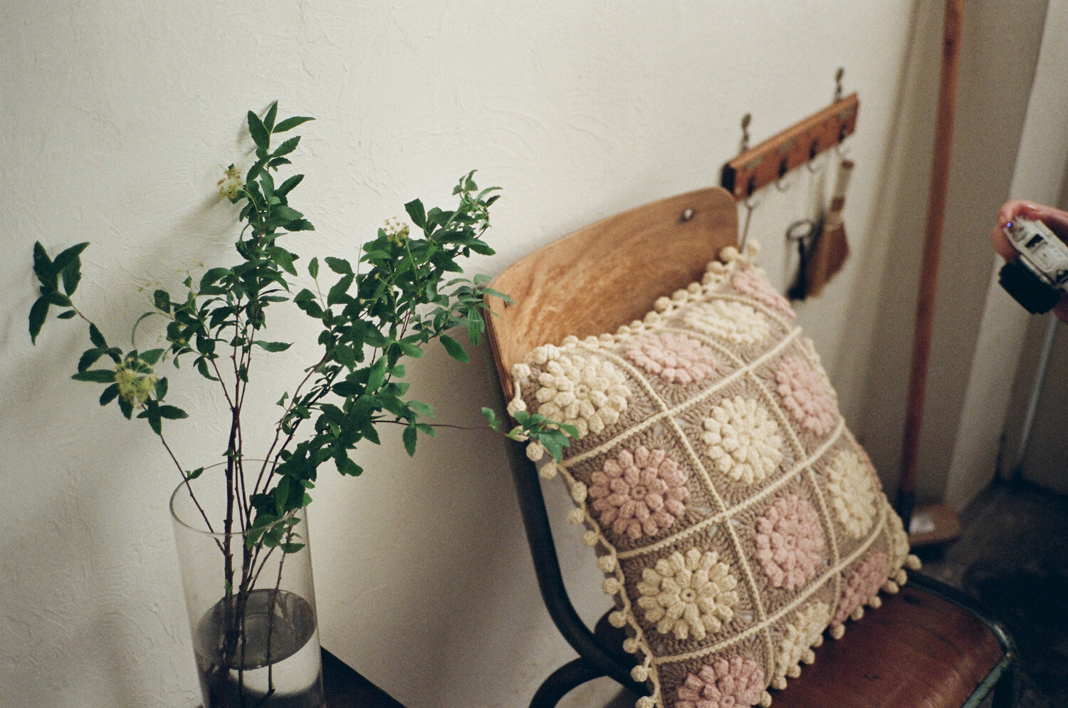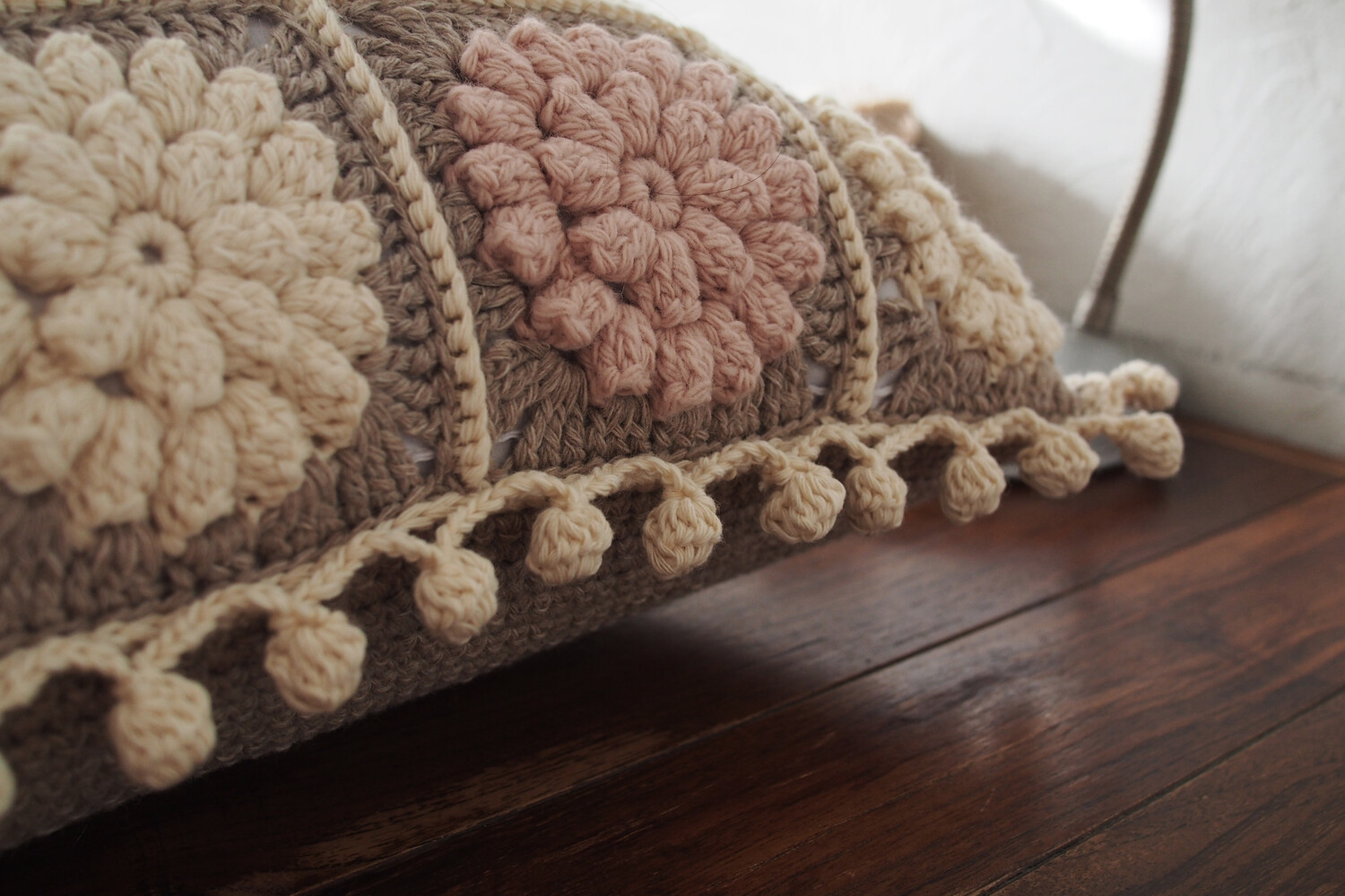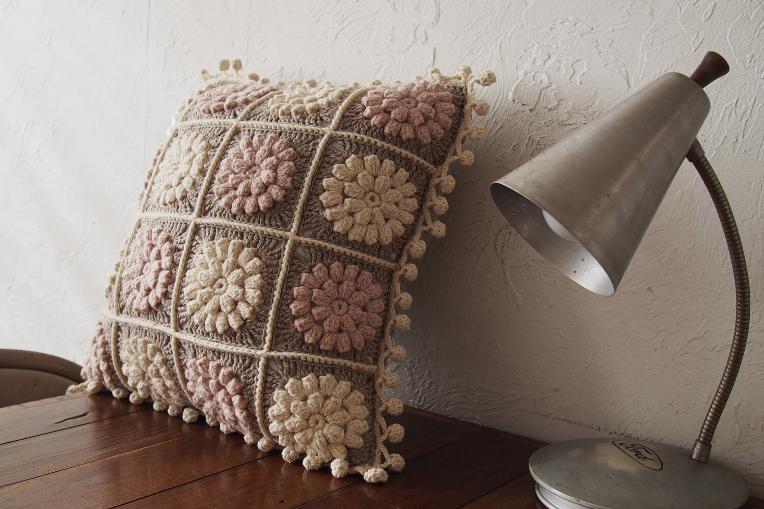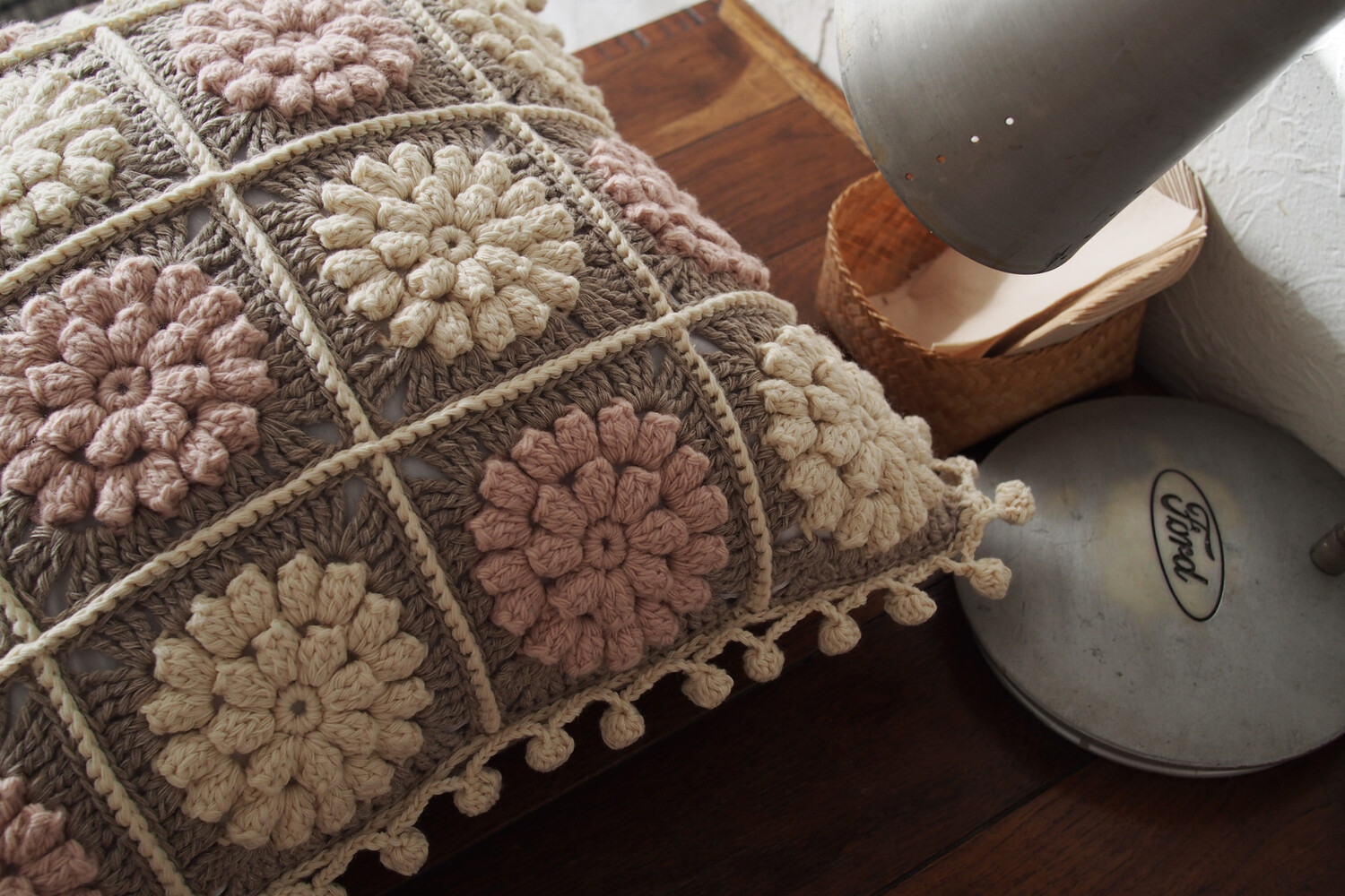 팝콘뜨기를 연습하면서 뜰 수 있는 모티브 쿠션입니다. 조각조각 모티브를 만들어 잇고 뒷면도 떠서 쿠션솜을 넣어 사용하면 됩니다. 보여드릴 컬러는 두가지예요. 첫번째 컬러인 올리브 그린 컬러는 화이트, 그레이, 올리브그린, 먹에 가까운 네이비의 조합이고요 제 개인적으로는 아주 유니크한 컬러조합이라고 생각합니다. 두번째 컬러인 핑크 컬러는 사랑스러운 느낌으로 떠 본 크림색과 옅은 핑크, 그리고 베이지의 조합입니다. 조금 로맨틱하기도 하고 빈티지하기도 하답니다. 그리고 포인트가 될 수 있는 폼폼엣징도 봐주세요.