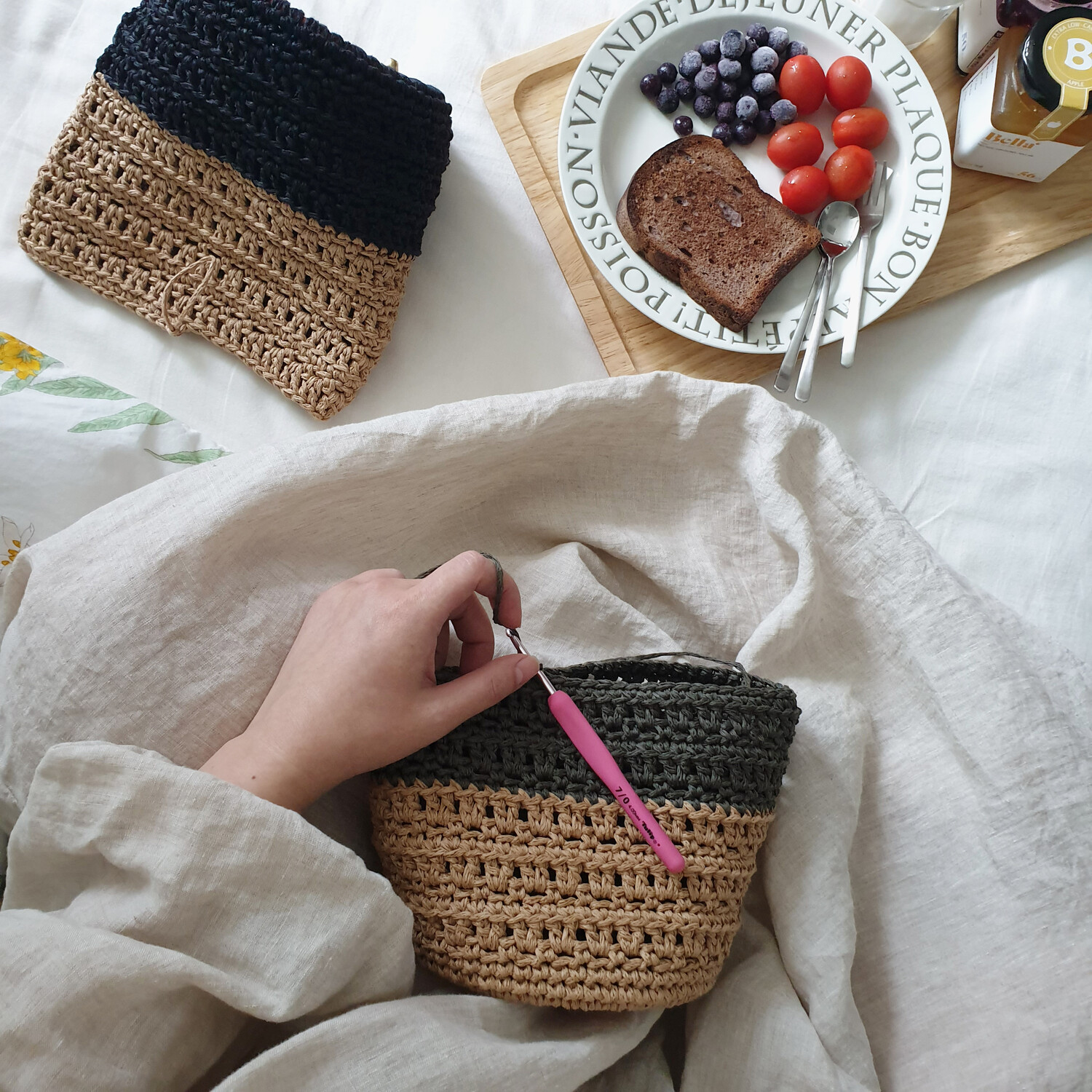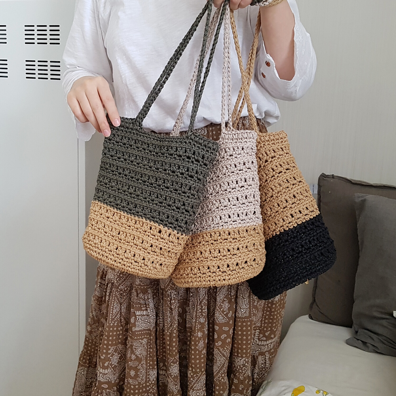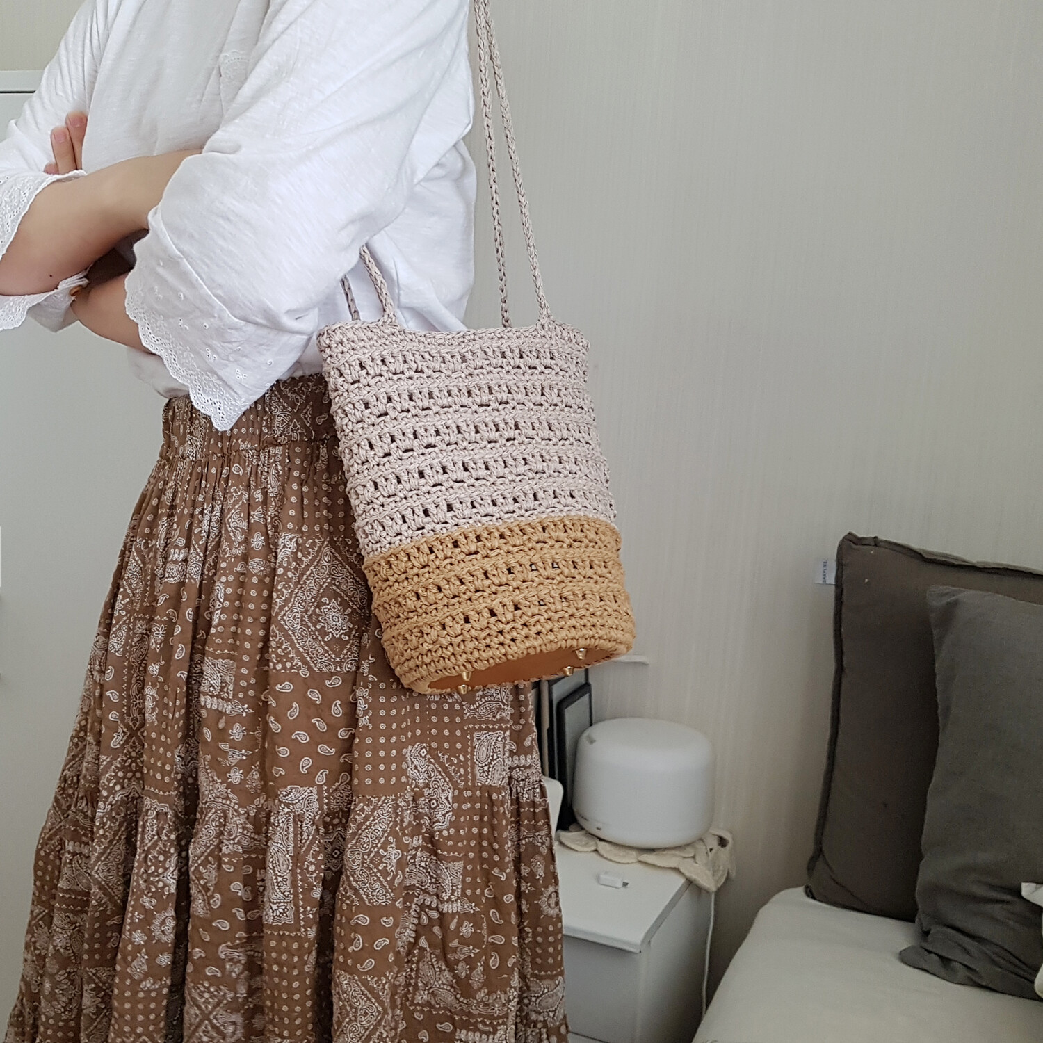 2020년에 진행했던 여름가방입니다. 당시에는 도안전용으로 진행했던 제품인데요. 키트로 구성해보려고 합니다. 린넨과 면 혼방의 고급스러운 실이라 일반 린넨 실보다는 부드럽게 뜰 수 있고 실의 굵기도 적당해서 뜨기 좋습니다. 약간 길쭉한 느낌으로 편안한 무드가 느껴져서 여기저기 잘 들수 있는 디자인이에요. 심플하면서도 배색의 느낌 때문에 멋스러운 가방입니다. 각이 딱 잡힌 스타일이기보다는 편안한 스타일이라 어디에나 들기 좋습니다. 내추럴한 색감은 말할 것도 없고요.